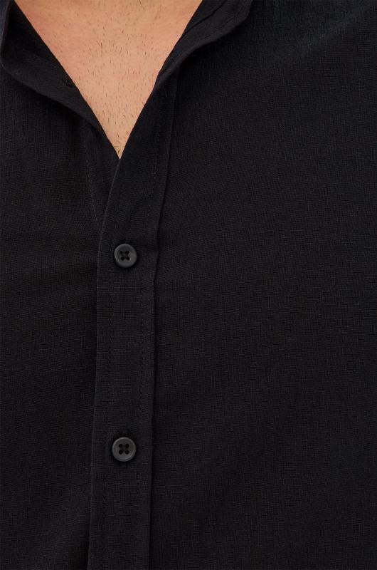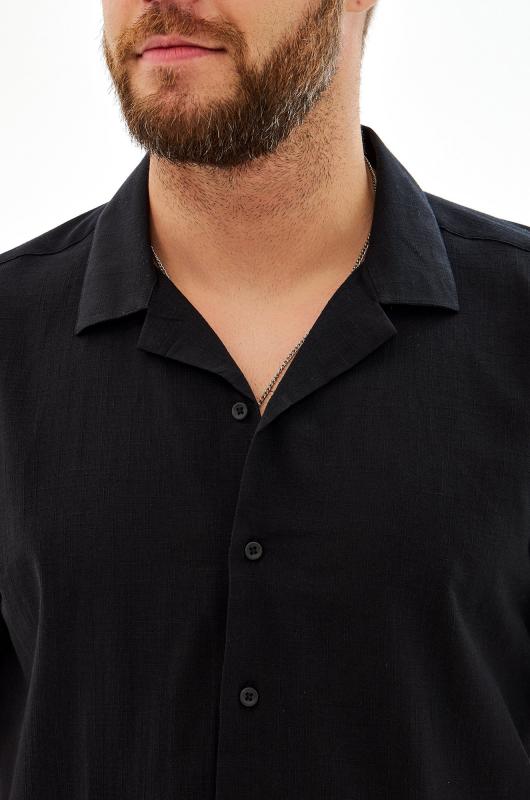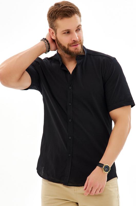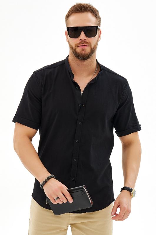 Стильная мужская рубашка выполнена из натуральных составляющих: хлопка и льна! Базовый черный цвет, застежка на классические пуговицы в сочетании с воротником-стойкой превратят каждый образ с этой рубашкой для мужчин в брутальный и лаконичный.
