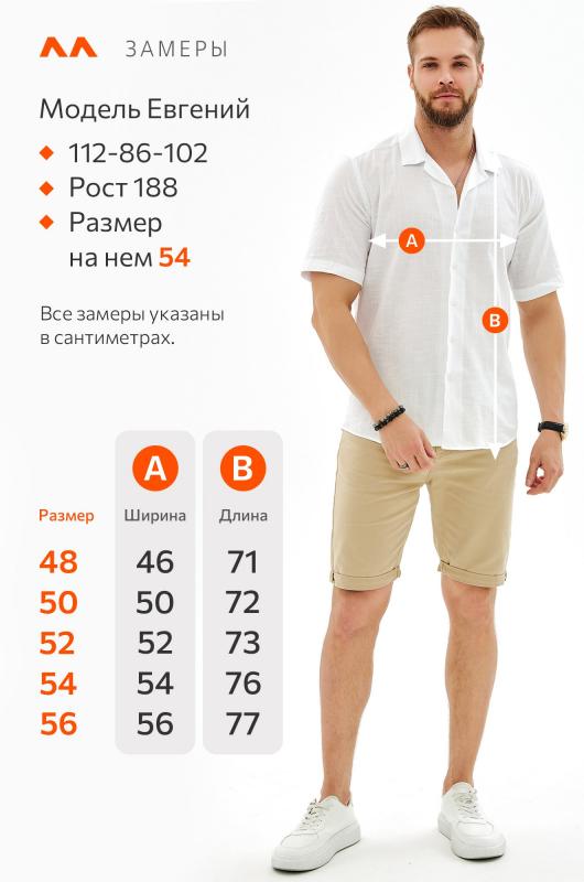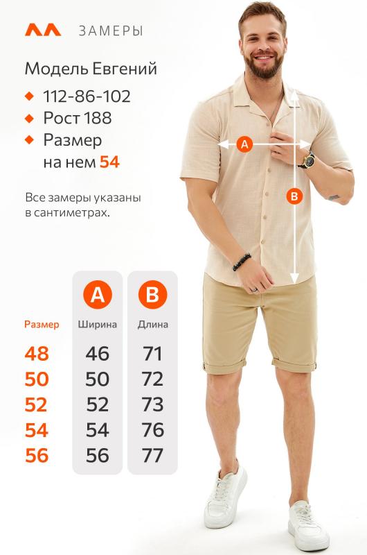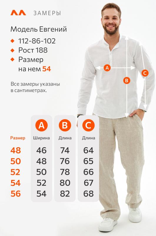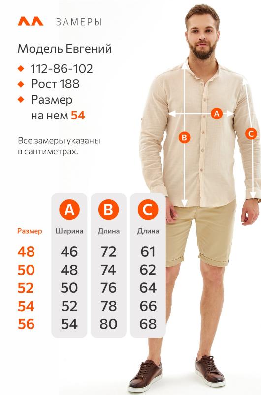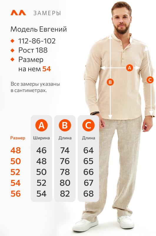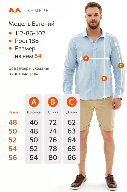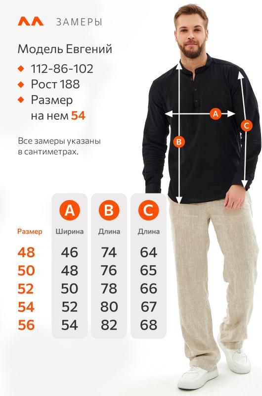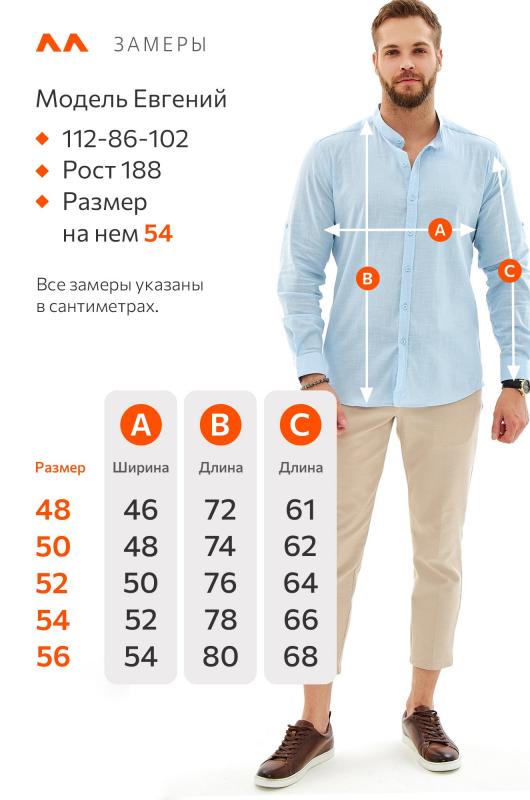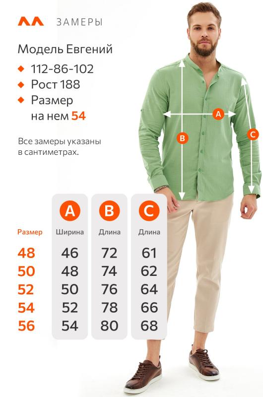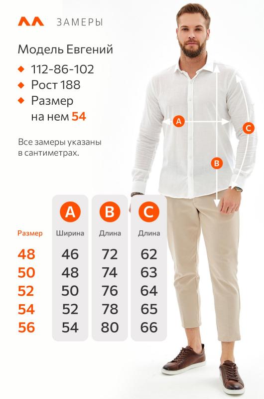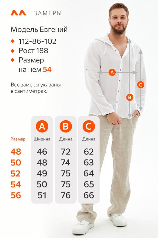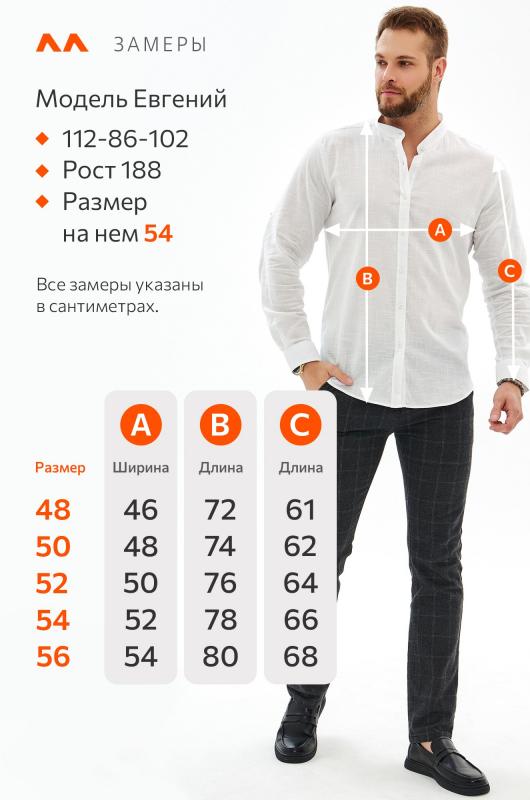 Модель Евгений, его рост 188 см, параметры 112-86-102 см. На нем рубашка марлёвка 54 размера.