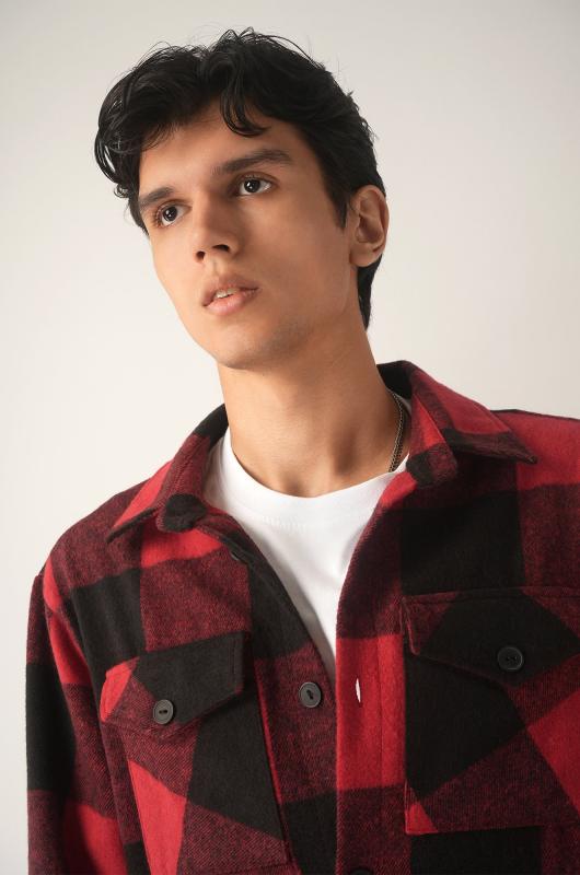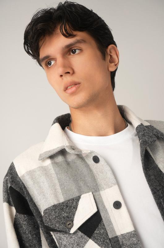 — клетчатая рубашка с длинным рукавом и отложным воротником добавляет образу харизмы