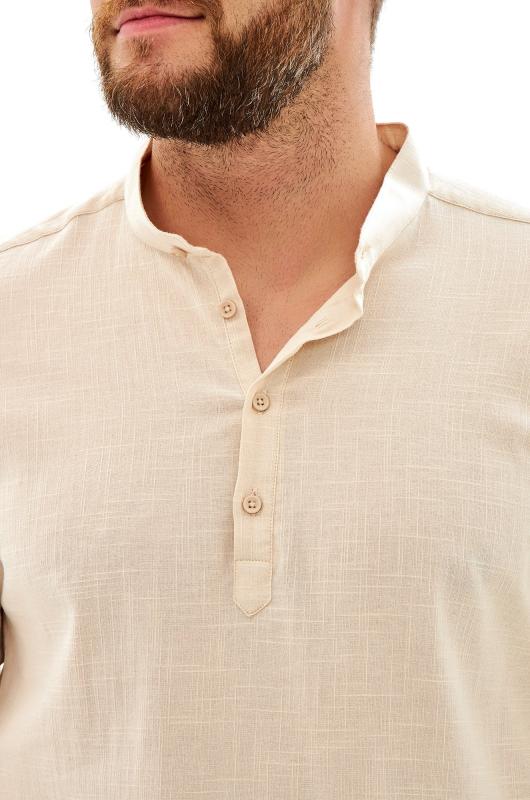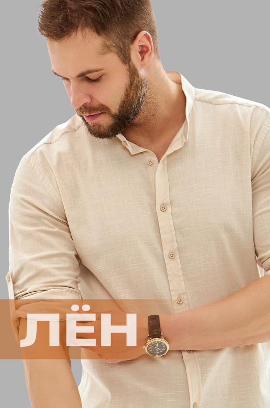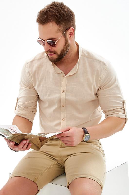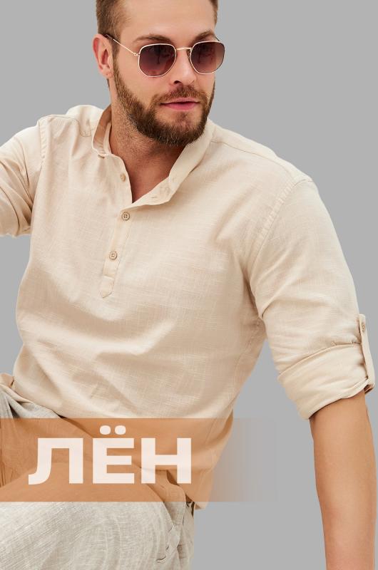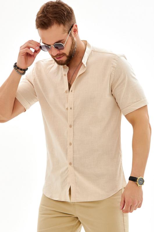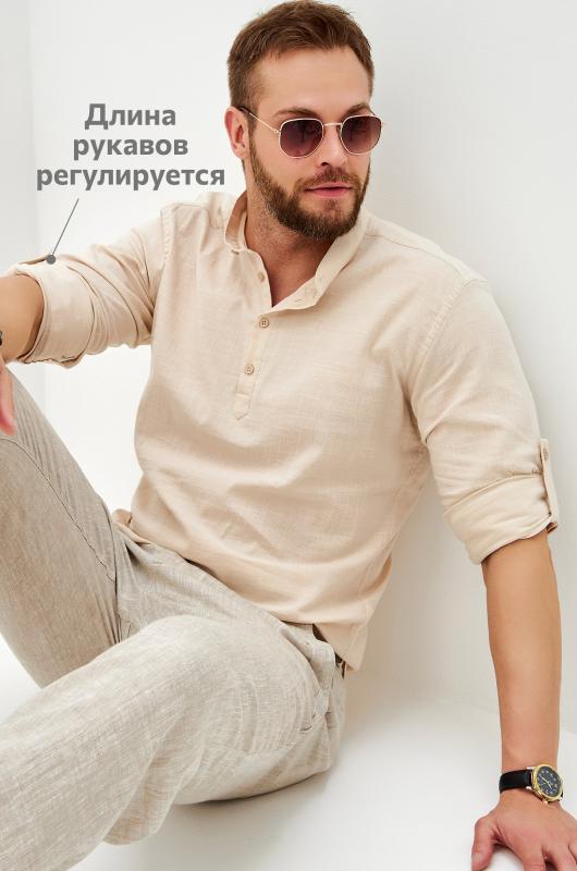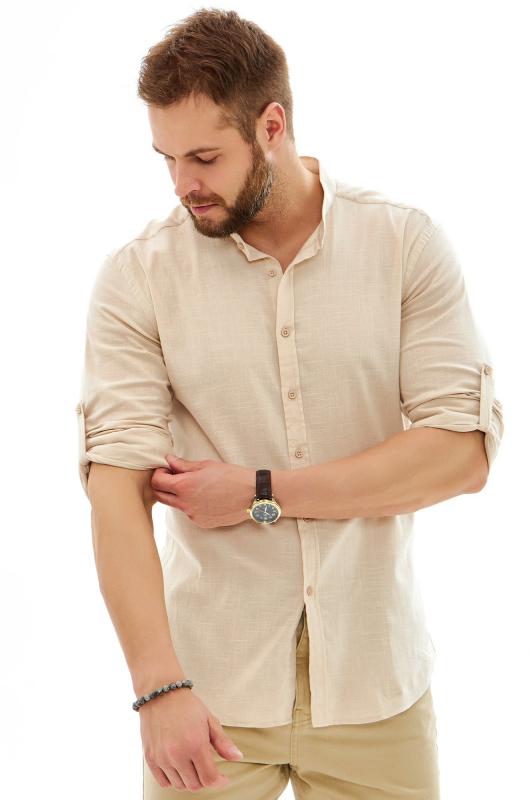 Стильная мужская рубашка выполнена из натуральных составляющих: хлопка и льна! Базовый песочный цвет, застежка на классические пуговицы в сочетании с воротником-стойкой превратят каждый образ с этой рубашкой для мужчин в брутальный и лаконичный.