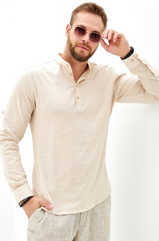 Бежевая рубашка выполнена из турецкой хлопковой ткани с добавлением льна. Воротник стойка придает образу харизмы. Льняная рубашка с длинным рукавом станет идеальным вариантом на каждый день: в офис, на прогулку, деловую встречу.