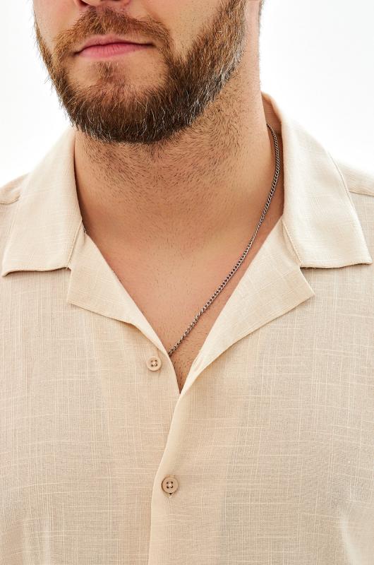Мужская рубашка выполнена из хлопка и льна – идеальный вариант для летних кэжуал-образов! Базовый бежевый цвет, застежка на классические пуговицы и короткие рукава в сочетании с воротником-стойкой превратят каждый образ в брутальный и лаконичный.