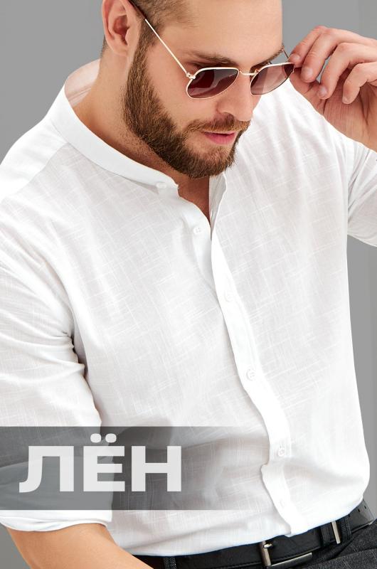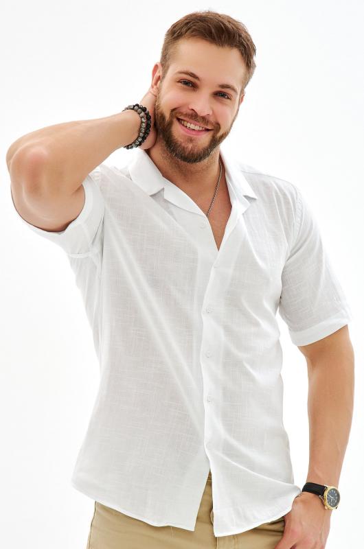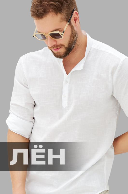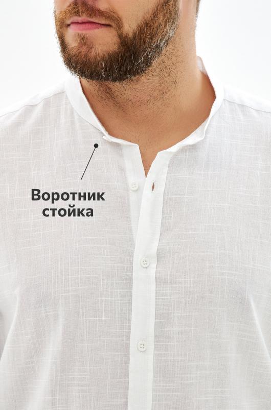 Стильная мужская рубашка выполнена из натуральных составляющих: хлопка и льна! Базовый белый цвет, застежка на классические пуговицы в сочетании с воротником-стойкой превратят каждый образ с этой рубашкой для мужчин в брутальный и лаконичный.