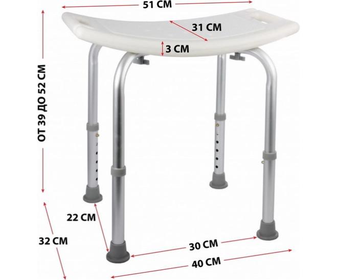 Стул-сиденье для купания в ванной и душе отличается регулируемыми ножками и устойчивостью даже на скользкой поверхности. Сиденье прочно крепится винтами к 2 перекрещенным опорам из алюминия, которые и образуют ножки стула. Благодаря этому сиденье становится особо прочным. Широкие резиновые накладки на ножки стула для купания обеспечивают особую устойчивость. Материалы, из которых изготовлен стул для душа, нейтральны к санитарной обработке.