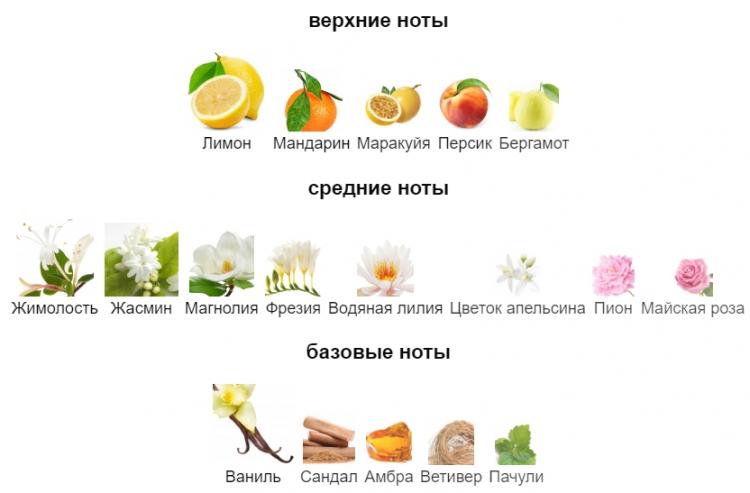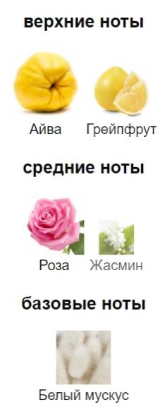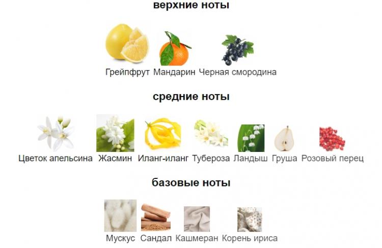 средние ноты: Ирис, Жасмин, Роза, Корень ириса и Ландыш