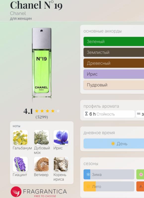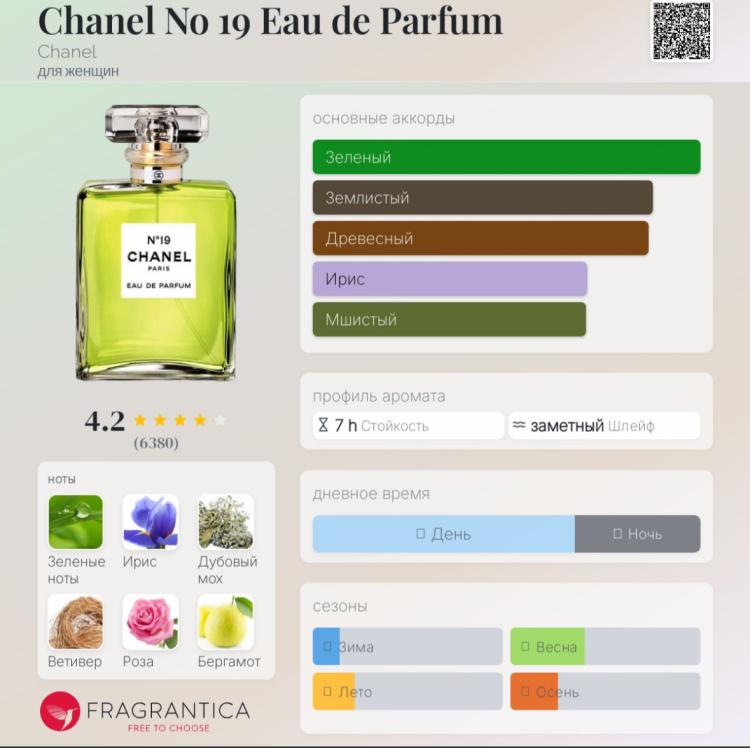 Chanel No 19 Eau de Parfum Chanel — это аромат для женщин, он принадлежит к группе цветочные зеленые. Верхние ноты: Зеленые ноты, Бергамот и Нероли