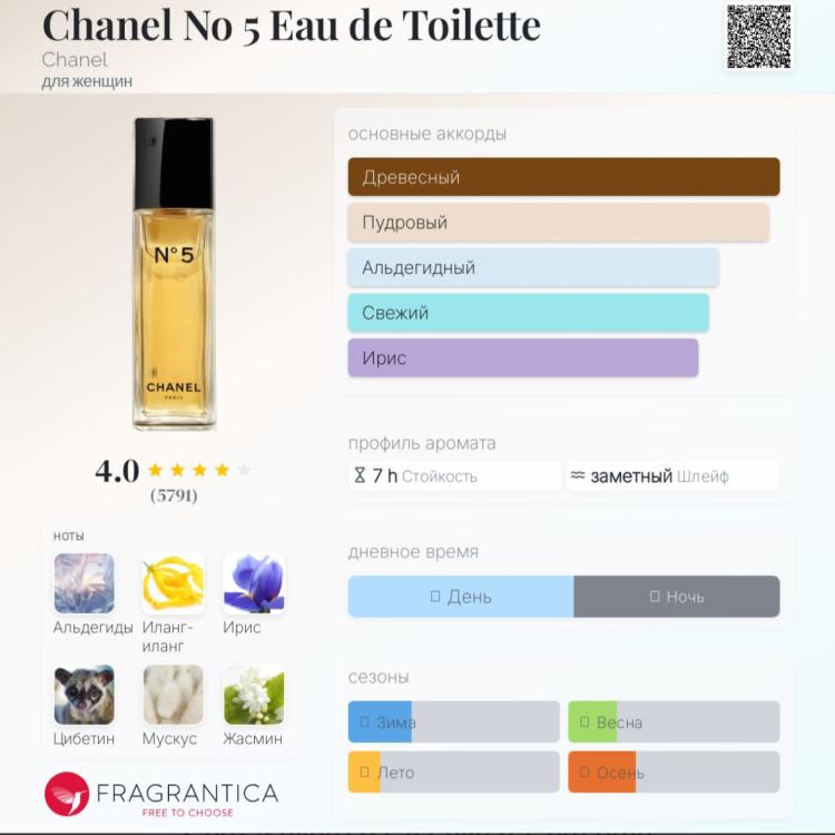 Chanel No 5 Eau de Toilette Chanel — это аромат для женщин, он принадлежит к группе цветочные альдегидные. Chanel No 5 Eau de Toilette выпущен в 1924 году. Парфюмер: Ernest Beaux. Верхние ноты: Альдегиды, Иланг-иланг, Нероли, Лимон и Бергамот