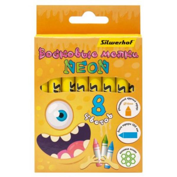 Восковые мелки Silwerhof Neon Монстрики 8цв. дл.100мм д.10мм картонная упаковка