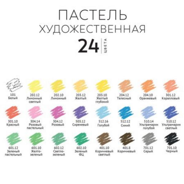 Обладает интенсивностью и яркостью цвета, хорошей кроющей способностью, смешиваемостью и мягкостью. Легко ложится на различные фактуры цветной бумаги, бумагу для рисования, картон, дерево, керамику. Количество цветов - 12. Форма сечения - круглая. Тип пастели - сухая.