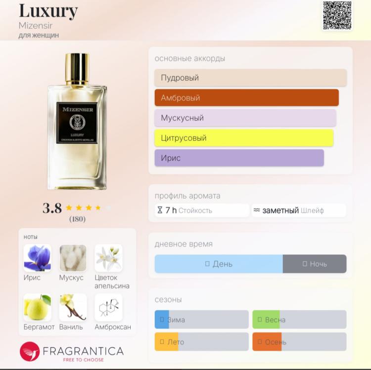 Душный, резкий, по началу пахнет кадилом и стариной. В этот раз достался сломанный пульвизатор. НО за годы закупок и огромное количество отливантов, такое всего лишь в третий раз. Брак бывает, ничего страшного. Взяла водичку из любопытства, типа как звучит столетний аромат.. ну и как будто действительно это так, как будто его законсервировали и потом по флаконам разлили. Приторный до невозможности. На морозе отлично звучит, но только зашёл в теплое помещение, ужас, сразу душит и глаза режет. Не знаю насколько нужно быть старым с атрофированными обонятельными рецепторами, чтоб пользоваться таким навязчивым ароматом.