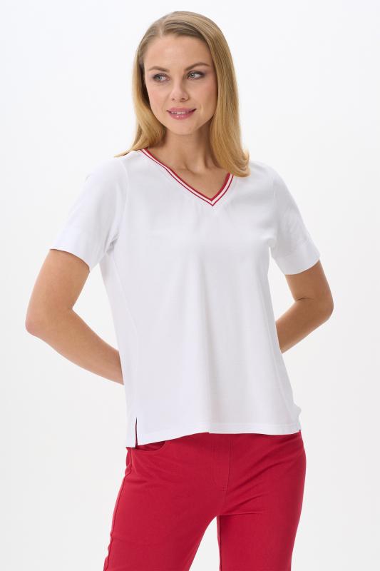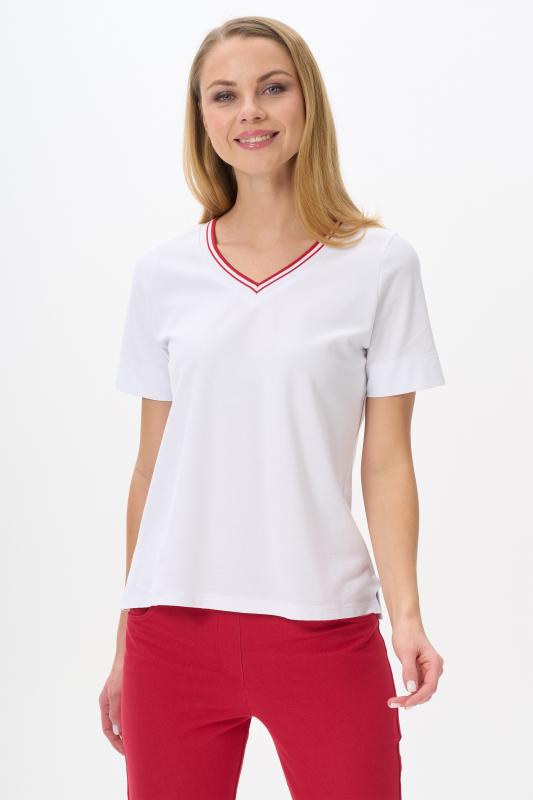 Футболка выполнена из хлопкового полотна пике. V-образный вырез горловины оформлен декоративной тесьмой, короткие рукава. Рост модели на фото 177.
